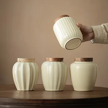 Country Style Stripe Design Beige Tea Canister With Wooden Lid for Office
